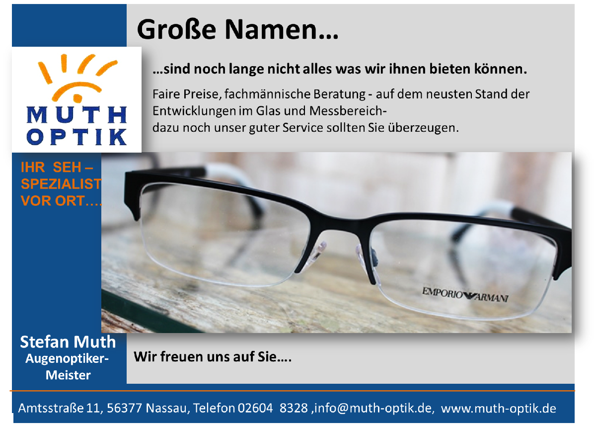 Öffnungszeiten: Montag bis Freitag von 9.00 bis 18.00 Uhr Samstag von 9.00 bis 13.00 Uhr und nach Vereinbarung. Telefon: 02604 8328 Mail: info@muth-optik.de
